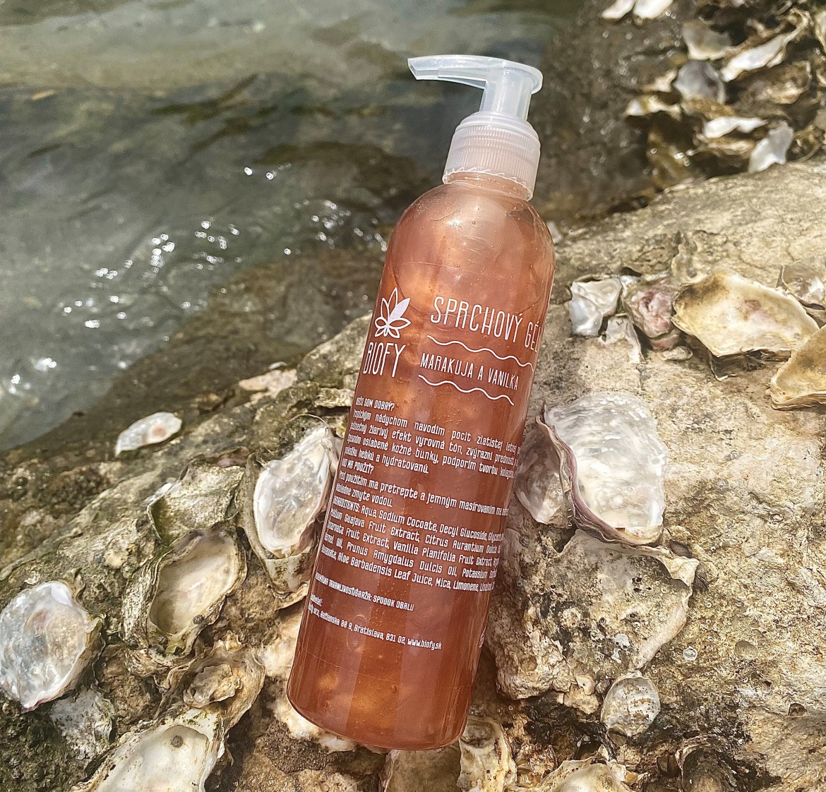 Aqua, Sodium Cocoate, Decyl Glucoside, Glycerin, Xanthan Gum, Psidium Guajava Fruit Extract (Extrakt z guajavy jablečné), Citrus Aurantium Dulcis Oil (Pomerančový olej), Passiflora Incarnata Fruit Extract (Extrakt z mučenky opletavé), Vanilla Planifolia Fruit Extract (Extrakt vanilky pravé), Argania Spinosa Kernel Oil (Arganový olej), Prunus Amygdalus Dulcis Oil (Mandlový olej), Potassium Sorbate, Sodium Benzoate, Aloe Barbadensis Leaf Juice (Aloe vera), Mica (Přírodní barvivo), Limonene*, Linalool*, Citronellol* *Přirozená součást esenciálních olejů